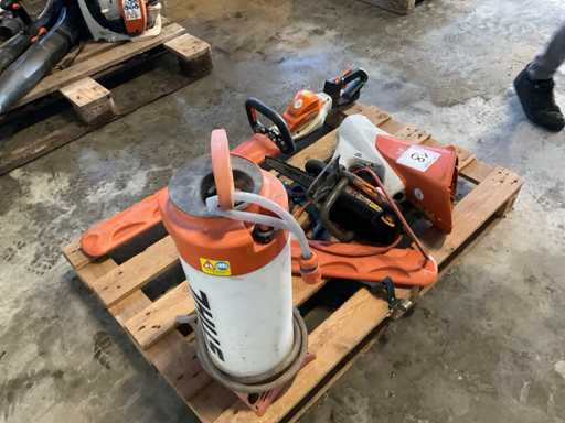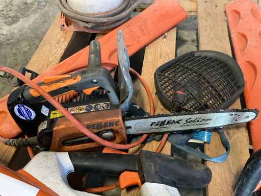 Composé de : taille-haie sans fil 65 cm, tronçonneuse électrique Pellenc 25 cm, carter de souffleur de feuilles, cuve haute pression.