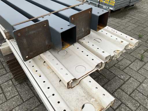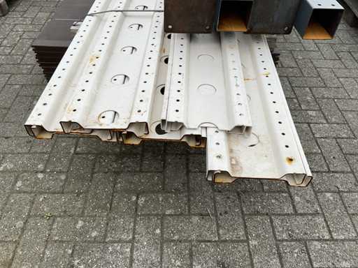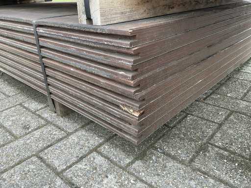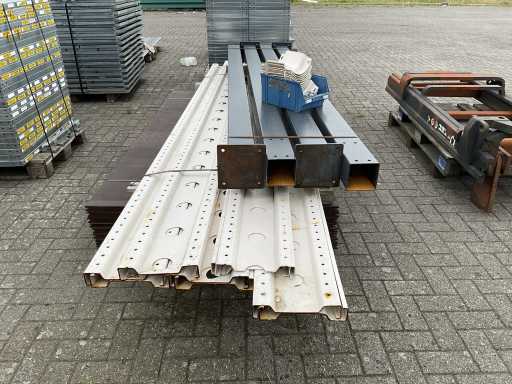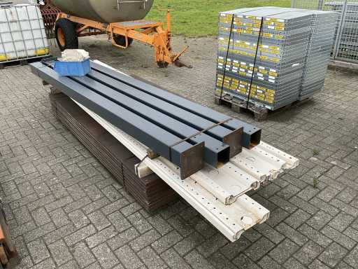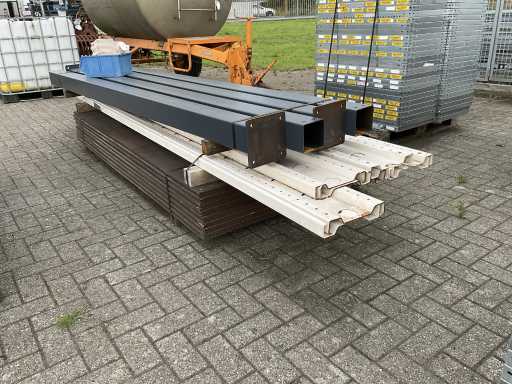 plancher pallier ; composé de 4 montants d’environ 297 cm de long ; 12 cm de large ; 8 plaques de sol d’environ 237 cm de long ; 123 cm de large ; 10 faisceaux ; Environ 365 cm de long
