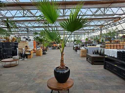 Apportez une ambiance de vacances méditerranéennes directement dans votre jardin ou terrasse ! Ce magnifique palmier Washingtonia impressionne par ses frondes en éventail caractéristiques et son tronc robuste. Avec une taille impressionnante d’environ À 180 cm, elle attire immédiatement l’attention. À noter particulièrement sa robustesse : elle est résistante jusqu’à -7°C et est livrée avec un pot noir brillant de haute qualité.
