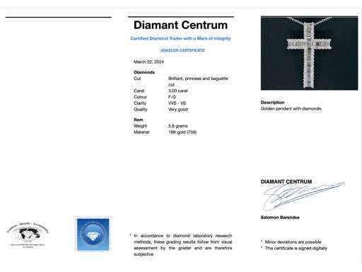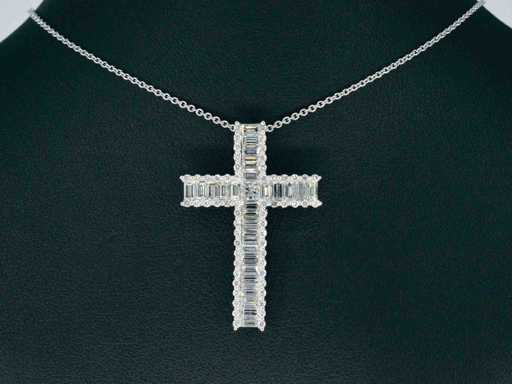 brillants Diamant : naturel ; Coupe : Brillant, coupe baguette et princesse ; Poids (carat) : 3,00 carats ; Couleur : F-G ; Pureté : VVS-CONTRE ; Qualité de la coupe : Très jolie ; Bijou : pendentif (hors collier) ; Poids : 5,8 onces ; Dimensions/longueur : 3,5 cm ; Matériau : or 18K (750) ; État : Neuf ; Emballage : Boîte à bijoux de luxe ; Explication : La qualité a été prise du rapport correspondant à l’article. L’évaluation est une évaluation d’un négociant certifié en diamants, basée sur les prix à la consommation ; Prix à la consommation : 17 833 €