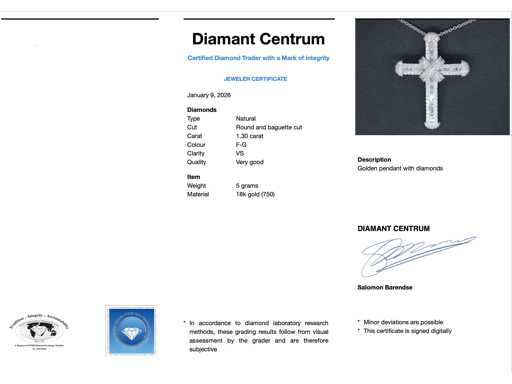 diamants Diamant : naturel ; Quantité : 181 pièces ; Coupe : Ronde et coupe baguette ; Poids (carats) : 1,30 carat ; Couleur : F-G ; Pureté : USA ; Qualité de la coupe : Très jolie ; Bijou : pendentif (hors collier) ; Poids : 5 grammes ; Dimensions/longueur : 3,3 cm ; Matériau : 18k carats (750) ; État : Neuf ; Emballage : Boîte à bijoux de luxe ; Explication : La qualité a été prise du rapport correspondant à l’article. L’évaluation est une évaluation d’un négociant certifié en diamants, basée sur les prix à la consommation ; Prix grand public : 8 540 €