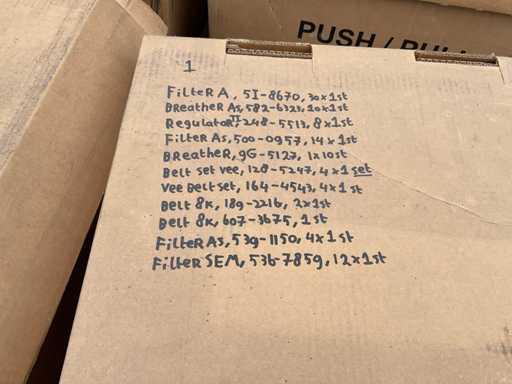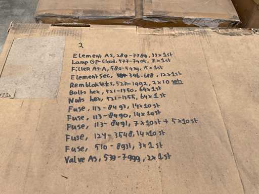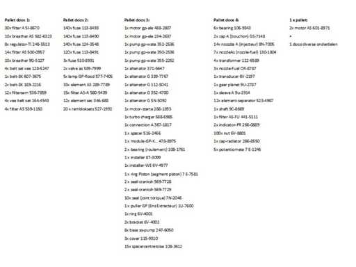 sur 5 palettes, composées, entre autres : filtres, joints, fusibles, moteurs d’essuie-glace, tubes, joints, lampes, courroies trapézoïdales,