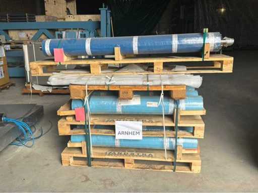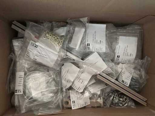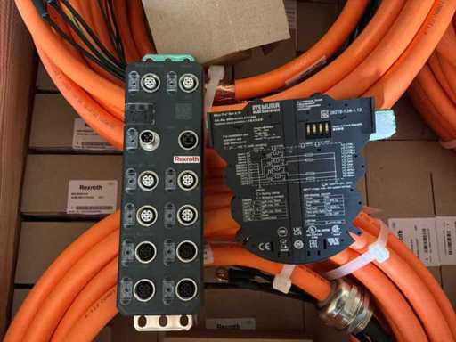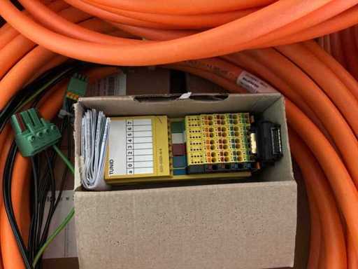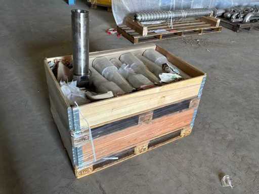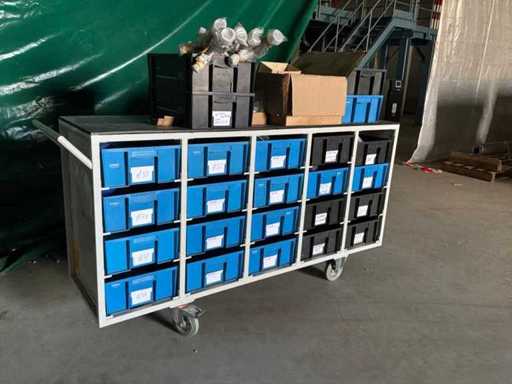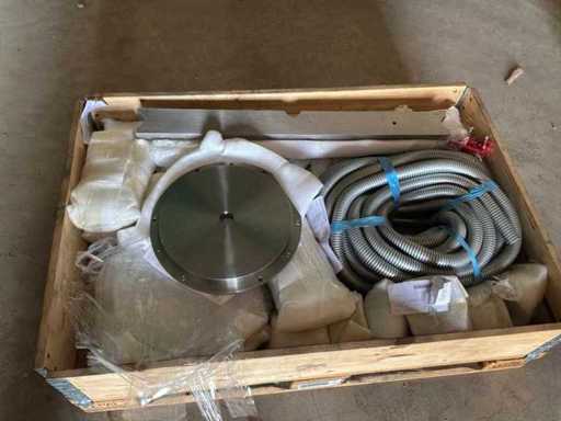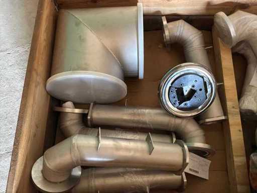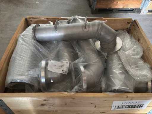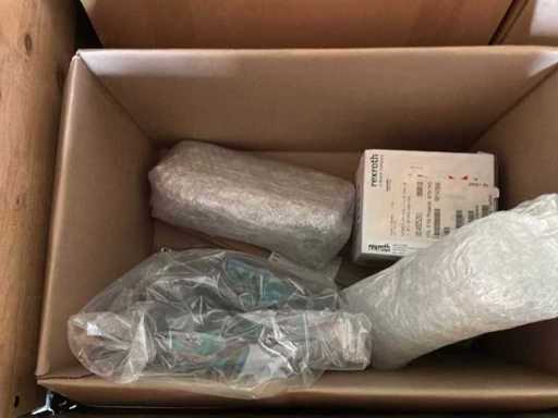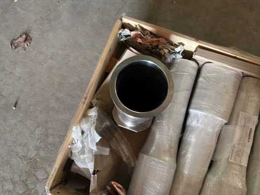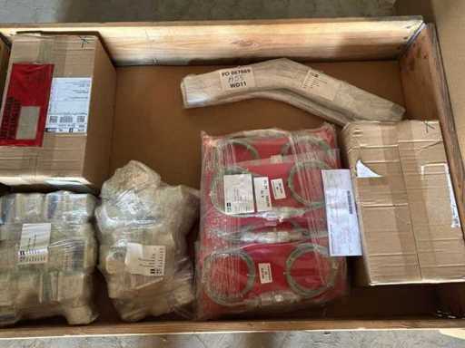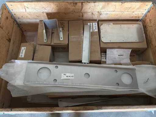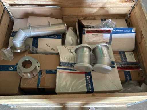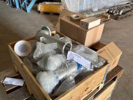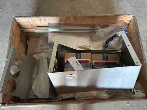Diverses pièces de machine appartenant au lot n° 5, comprenant notamment : pièces en acier inoxydable, divers composants électriques, soupapes de pression, pinces, câbles, variateurs de courant alternatif, débitmètre, tuyaux en aluminium, divers tuyaux de dépôt, 2x rack de stockage mobile.