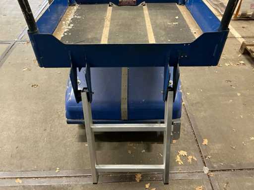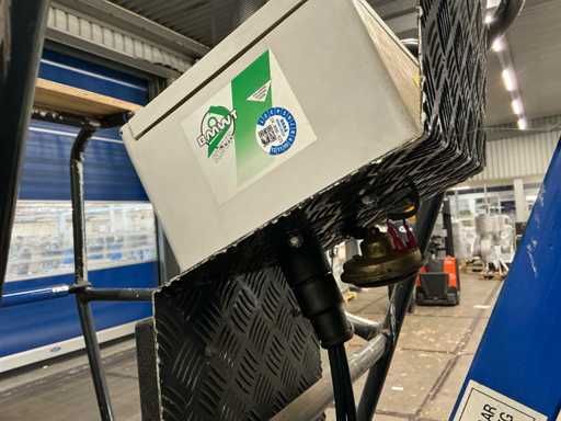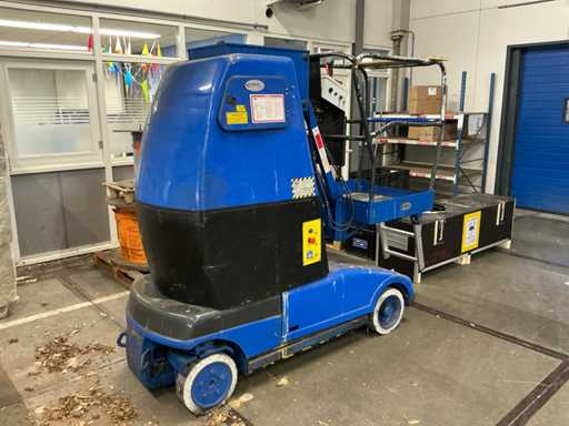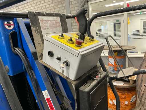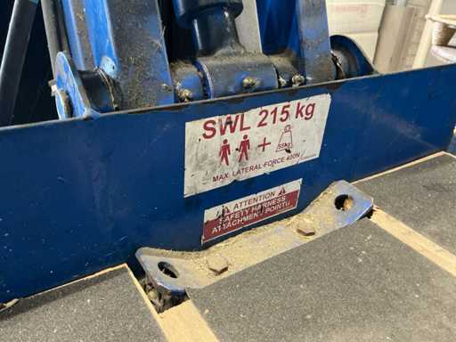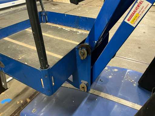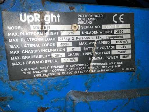 Équipé de : hauteur de travail 8 m, charge nette 215 kg, longueur de plateforme 0,74 m, largeur de plateforme 0,78 m, longueur de transport 2,43 m, largeur de transport 0,81 m, poids 2570 kg, max. portée 2,63 m, autonomie jusqu’à 3 m, capacité de plateforme pour 2 personnes et outils, bras articulé de 138°, rotation du mât à 360°, fonctionnement proportionnel d’une main, large de seulement 810 mm, rayon de braquage de 300 mm, conduite en pleine surlève, pneus sans marques, chargeur de batterie intégré 220V, 4 batteries 6V x 375 AH,