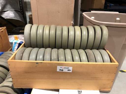 Roues en plastique avec pneu en caoutchouc increvable. 175 mm x axe 18 mm moyeu environ 35 mm Ses roues neuves et inutilisées.