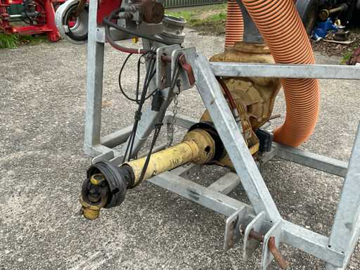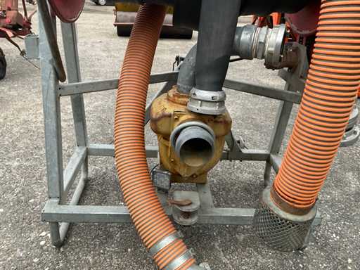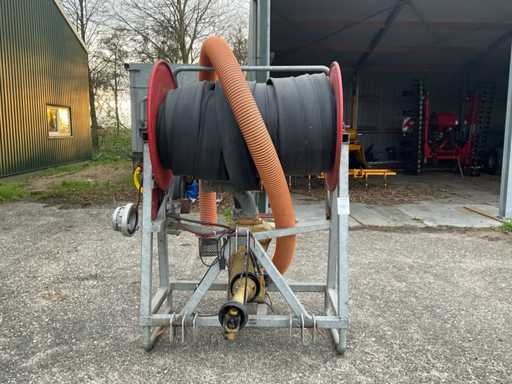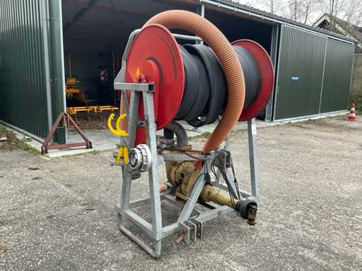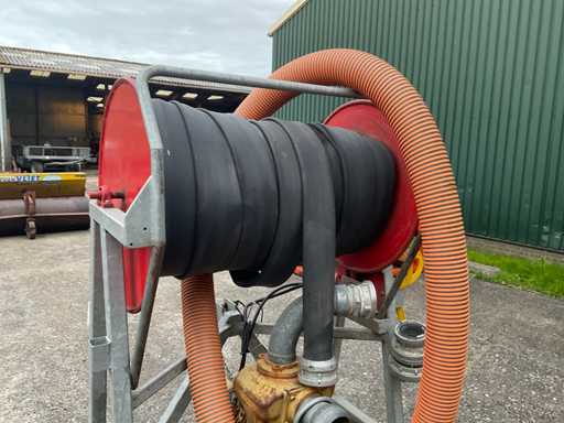 Tuyau d’aspiration de 5 pouces avec panier d’aspiration, raccord Storz presse de 4 pouces, tuyau d’eau de 4 pouces L 90 mtr, entraînement hydraulique par bobine, 2 pièces d’accouplement adaptateurs 6x4, 2 clés Storz