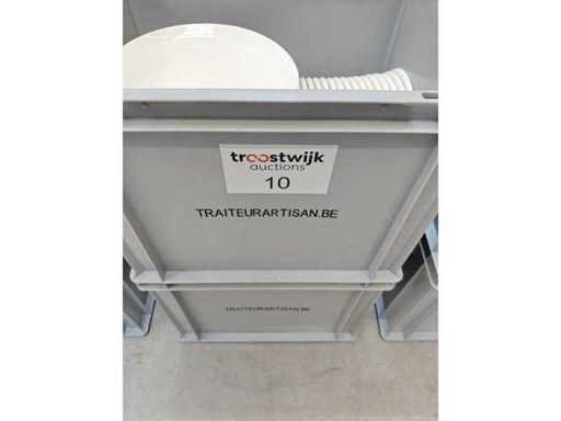 2 bacs de transport contenant environ 90 assiettes de dessert, couleur blanche