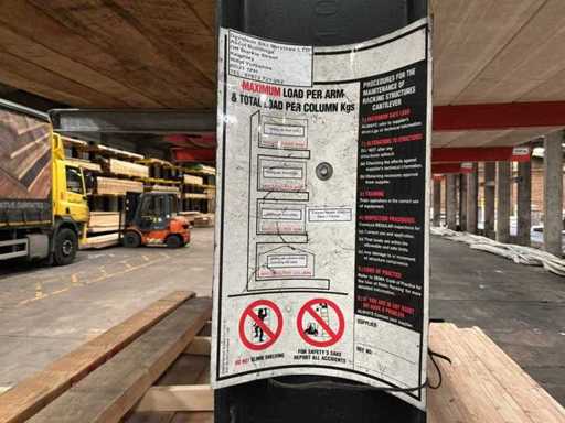 Ce groupe compte 8 pieds et 48 bras ; Déjà démonté ; est livré démonté ; debout ; les bras étaient réglables en hauteur ; hauteur de colonne 4800 mm ; longueur du bras 1240 mm ; capacité de charge par bras 1000 kg ; sans contenu ;