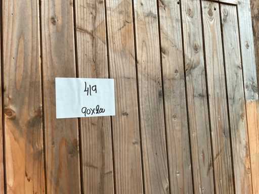 Porte extérieure Douglas dans cadre 200x90 cm, livrée SANS charnières ni serrures. Remarque : 1 étagère est endommagée, ceci est inclus. Le seuil est également lâche. Devant légèrement grisé, voir photos pour plus de détails.
