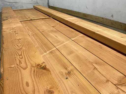 Poutres en ferlin Douglas rabotées PFEC, rabotées à plat tout autour, d’une taille de 400 x 22 x 7 cm chacune.