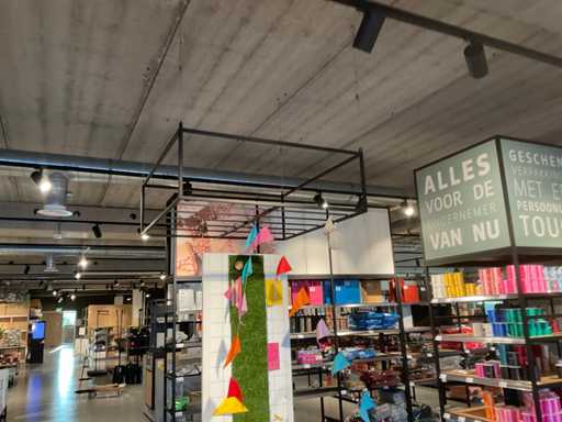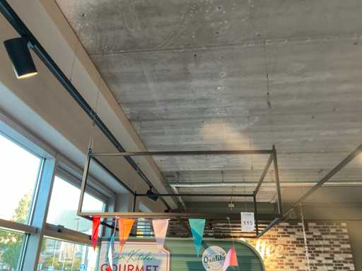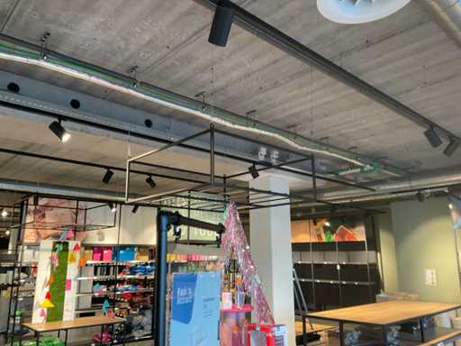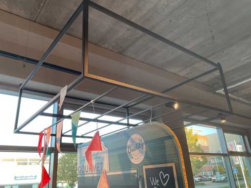 Les présentoirs sont suspendus au plafond à environ 370 cm de hauteur, y compris les câbles de suspension avec crochets, à l’exclusion des œillets montés au plafond et de la décoration.