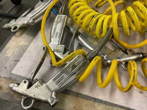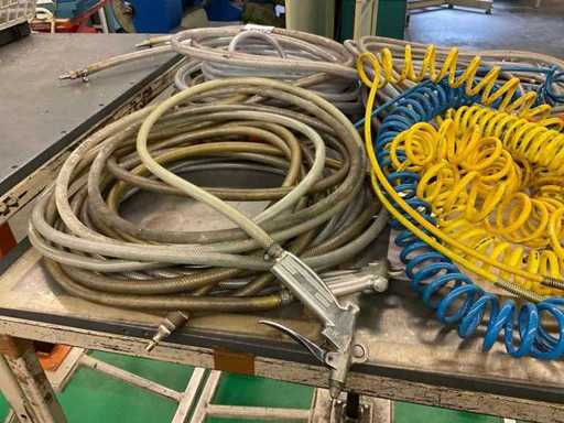 Différentes longueurs de tuyaux d’air avec raccords/connexions, pièces en T et pistolets à souffler environ 6 pièces, table de travail non incluse