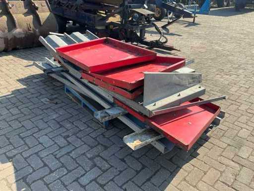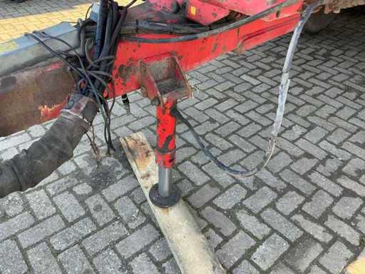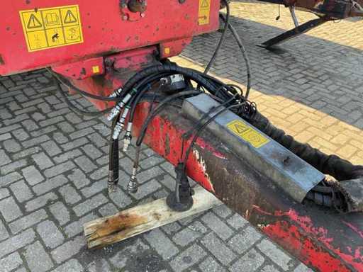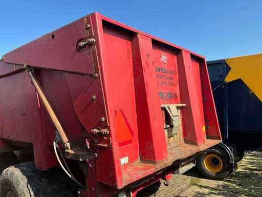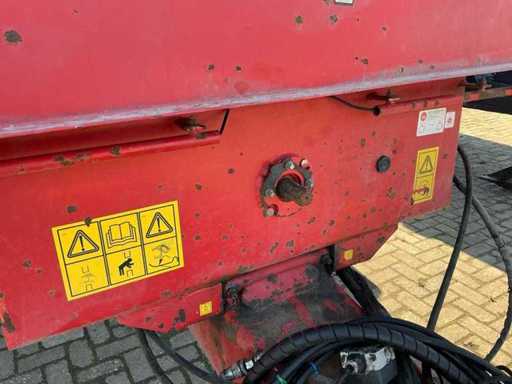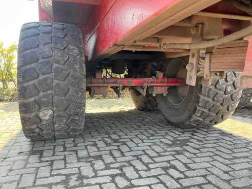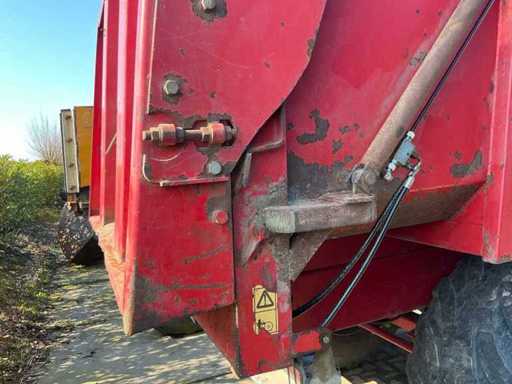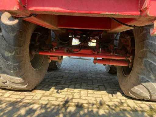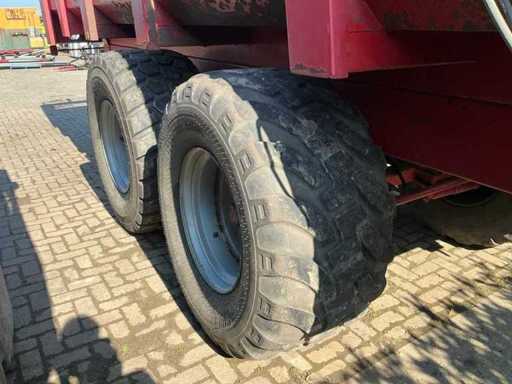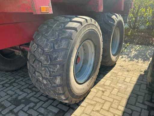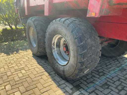 Équipé, entre autres, d’un châssis tandem à ressorts à lames, d’une jambe de support hydraulique, d’une barre d’attraction à ressorts à lames, d’un cloison arrière hydraulique avec pousseuse de grains. Taille des pneus 650/55R26.5. Inclut des accessoires d’ensilage 800 mm.