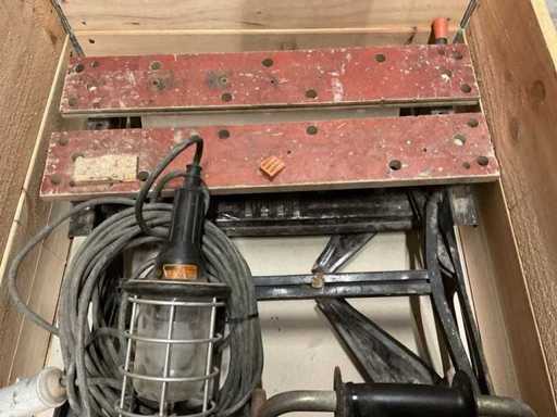Y compris des lampes de chantier halogènes, une lampe à main et un établi.