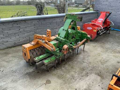 Herse rotative robuste pour la préparation du lit de semance, équipée d’un entraînement PTO et d’un packer/rouleau de pression à l’arrière pour un effritage et un nivellement optimaux du sol.