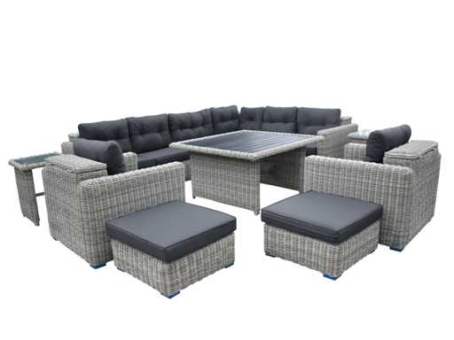 Type : DIJON-078 Couleur : osier rond gris clair, coussins gris foncé Modèle : Ensemble salon 11 pièces avec compartiments de rangement Dimensions : Ensemble 11 pièces : 2* canapé latéral : 152x95x80cm 1* canapé d’angle 95x95x80cm 2* canapé simple 95x95x80cm 2* ottoman 71x71x30cm 1* table 130x140x70cm 2* 55x55x70cm 1* canapé central 90x95x80cm Les coussins peuvent être rangés dans la boîte à coussins