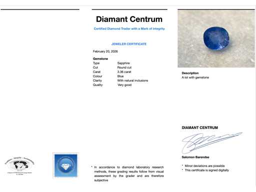 carats Pierre précieuse : Saphir ; Quantité : 1 pièce ; Coupe : Coupe ronde ; Poids (carats) : 3,36 carats ; Couleur : Bleu ; Pureté : Avec des inclusions naturelles ; Qualité de la coupe : Très jolie ; Qualité : Non traitée, seulement chauffée ; État : Neuf ; Emballage : Boîte à gemmes ; Explication : La qualité a été prise du rapport correspondant à l’article. L’évaluation est une évaluation d’un négociant certifié en diamants, basée sur les prix à la consommation ; Prix grand public : 4 440 €