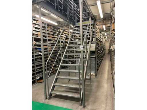 Escalier en acier avec 15 marches en plaques à damier, largeur d’environ 108 cm et 2 rampes