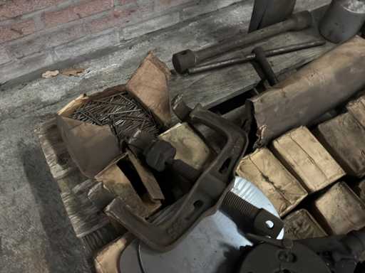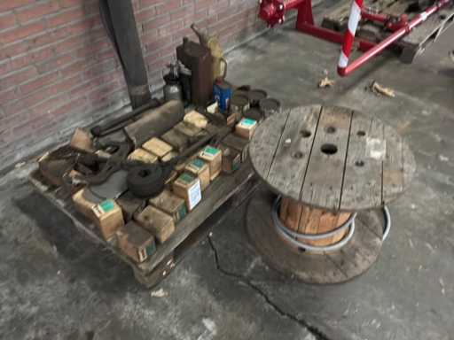 Notamment : tapis en caoutchouc, bobine en bois à câbles, boulons à 6 côtés incluant 6x35, divers outils manuels