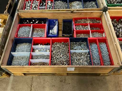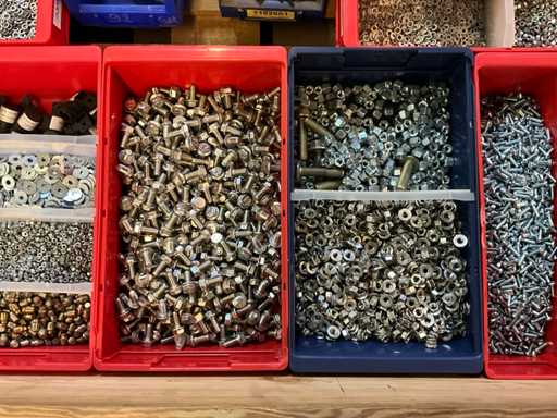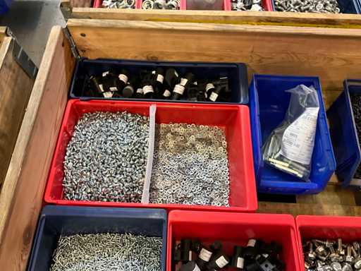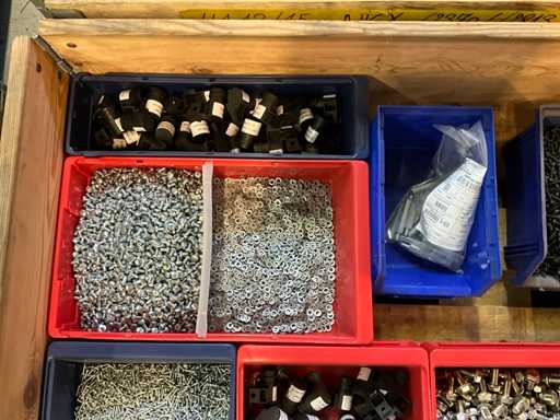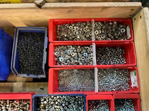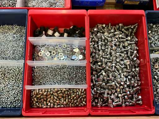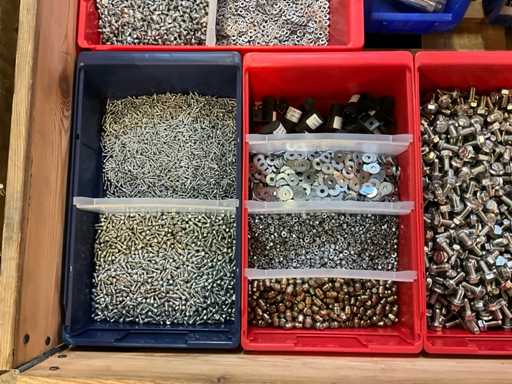 Composé de 13 bacs de rangement en plastique avec boulons, écrous, vis, etc