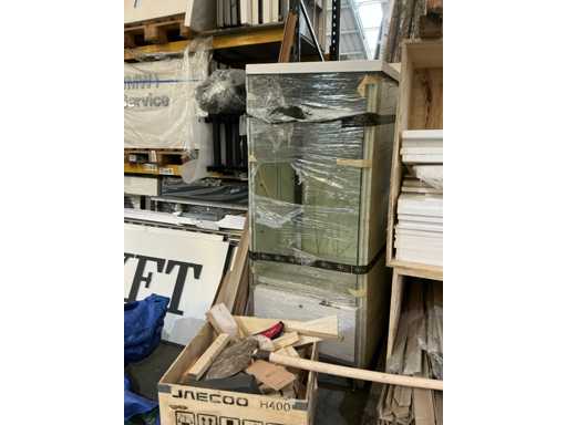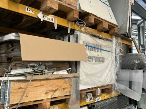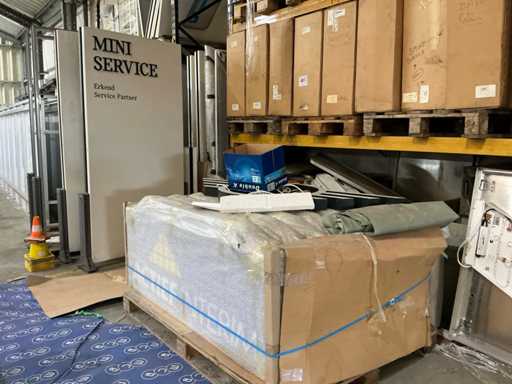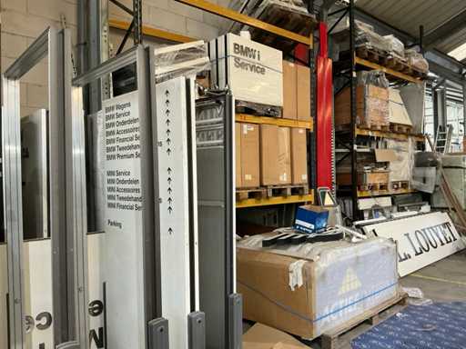 Incluant BMW, MINI, OKAY, etc., composés de 12 montants en aluminium différents et de taille 100 x 20 x 206 cm, environ 75 boîtes lumineuses différentes BMW incluant la BMW Service incluant 100 x 70 cm et 120 x 90 cm, 5 boîtes lumineuses différentes dont 340 x 93 x 18 cm, avec 2 boîtes contenant divers panneaux pour les magasins, 8 boîtes lumineuses différentes ACTIVE INTERIM de dimensions 160 x 15 x 68 cm, avec vitrine ouverte avec 3 niveaux et tiroir, dimensions approximatives de 68 x 70 x 180 cm, etc., livraison selon les instructions sur 3 étagères, sauf les étagères