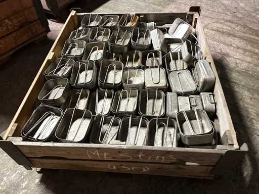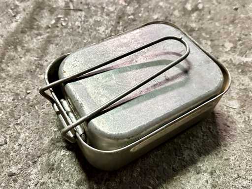 Environ 100 jeux de gamelles en aluminium. Les deux casseroles s’emboîtent l’une dans l’autre et sont idéales pour les déplacements, non seulement pour le soldat, mais aussi pour le randonneur et le campeur. Dimensions 18,2 x 13,5 x 5,8 cm et 16,8 x 13,1 x 5,4 cm (L x l x H).