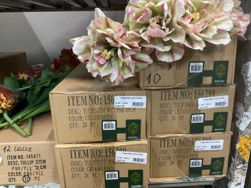 Contenu du chariot, différents types de fleurs artificielles Silk_Ka, y compris les tulipes, les branches de fraisier, l’iris, la lavande, le freesia, diverses couleurs, chariot non inclus