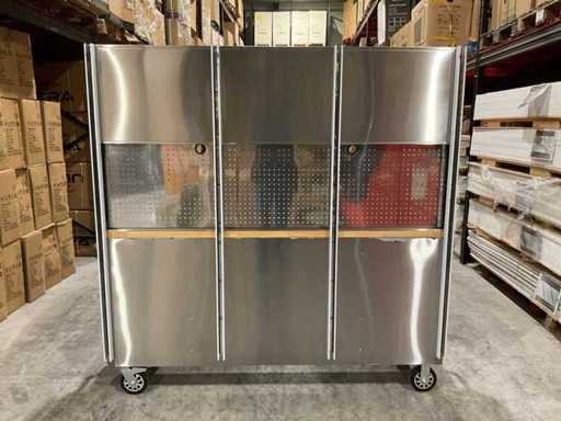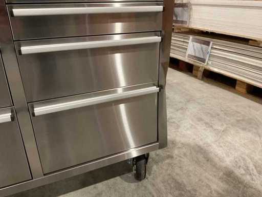 Équipé de tout le 430 en acier inoxydable anti-empreintes digitales ; 15 tiroirs ; 3 armoires hautes ; mur du fond ; Un plan de travail en bois de 35 mm ; 2 poignées ; 4 roues de 6 pouces dont 2 roues avec freins ; verrouillable à l’aide d’une clé ; inutilisé dans la boîte (dimensions de transport 190x55x130 cm) Dommages de transport