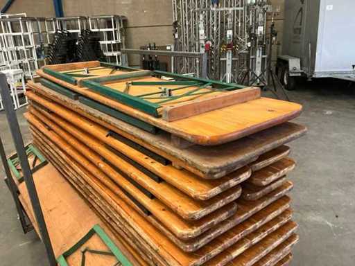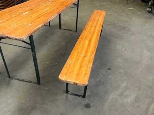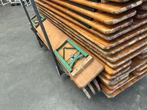 Chacun équipé de deux établis de dimensions approximatives 220 x 25 x 50 cm. Allongé sur un chariot de transport aux dimensions d’environ 100 x 100 x 140 cm. Table à bière supplémentaire 2x (autre modèle) + 5x établi