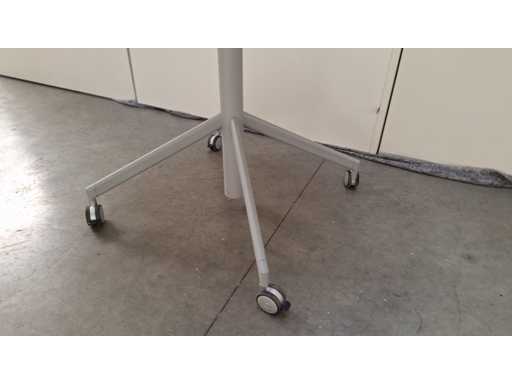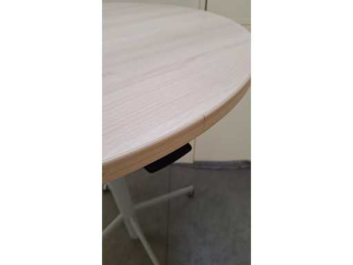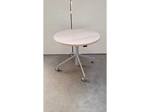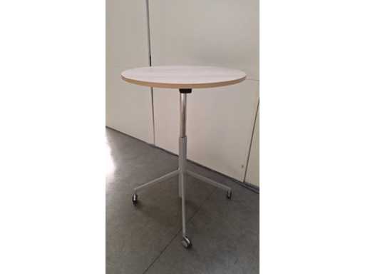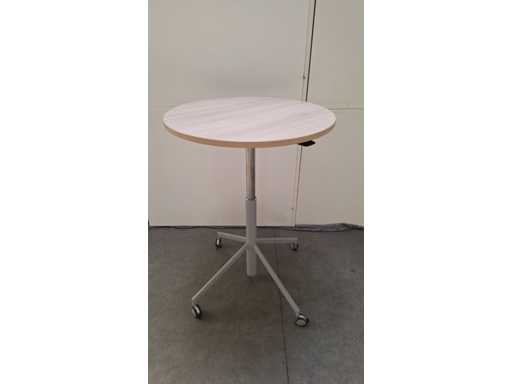 Réglable hydrauliquement en hauteur (720 - 1120 mm) Base mobile en métal gris équipée de roues pivotantes réparables, dessus en chêne clair couleur mélamine, en bon état