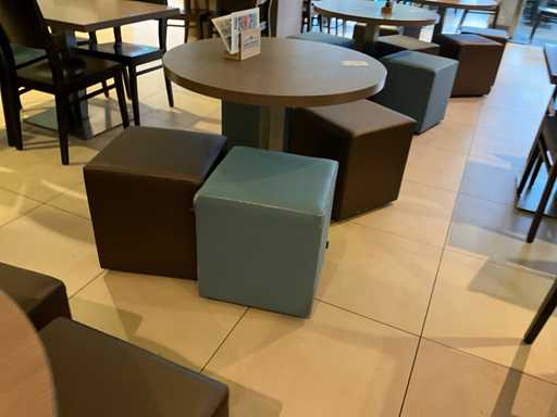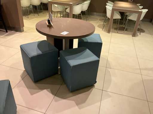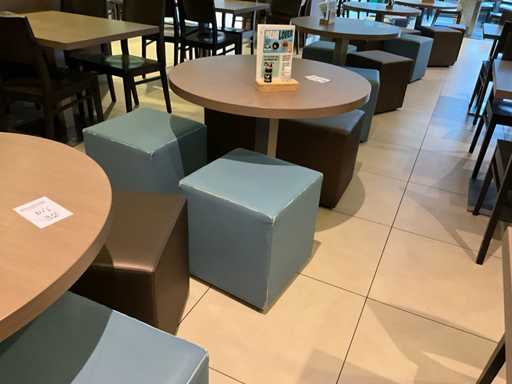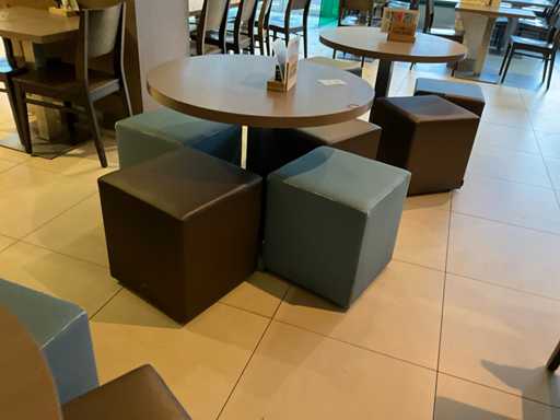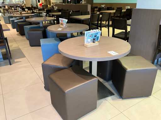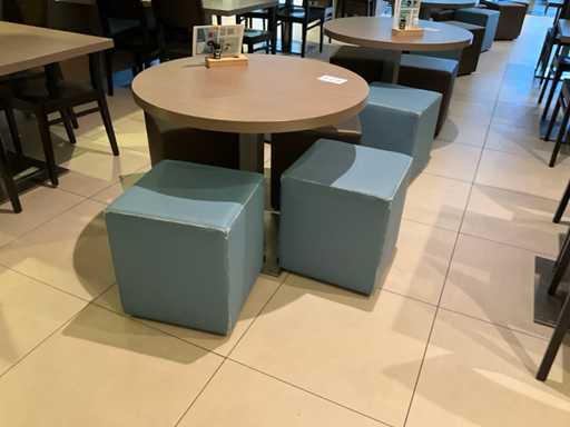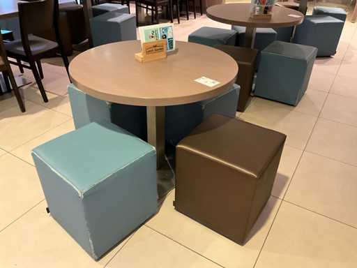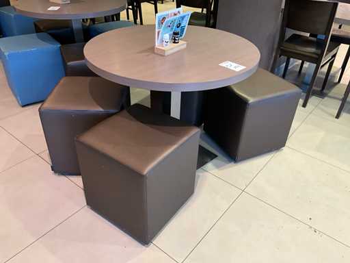 Diamètre du plateau 90cm, dimensions du pouf 42x42x47cm