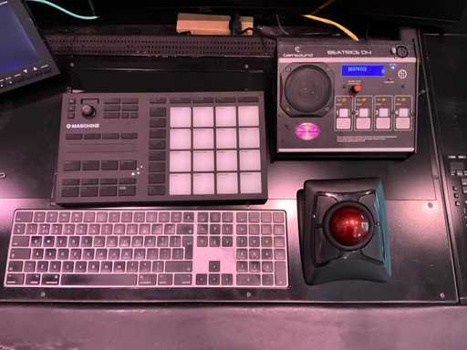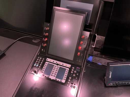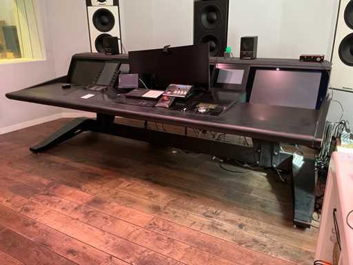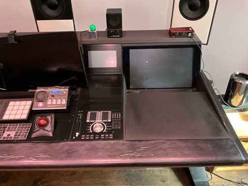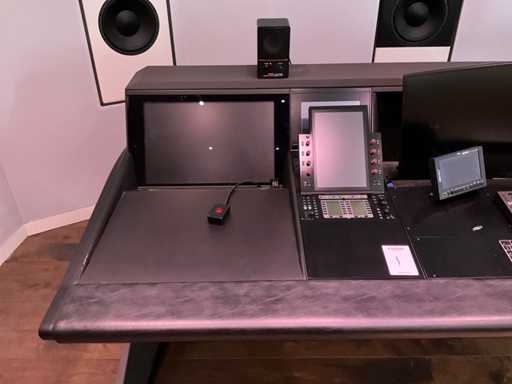L’équipement comprend : surface de contrôle Avid S6 M10, moniteur LCD Datavideo tlm-700hd 7" tft, contrôleur Native Instruments Maschine Mikro MK3, souris experte Kensington M01286-M, interphone audio réseau Glensound Beatrice D4 4 canaux, 2x haut-parleur actif Fostex 6301B, Dell Ultrasharp U3818DW est un écran ultra-large incurvé de 38 pouces, interface focusrite scarlett 2i2,