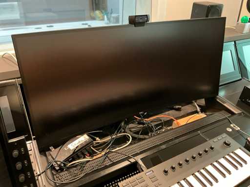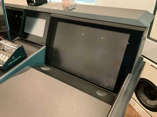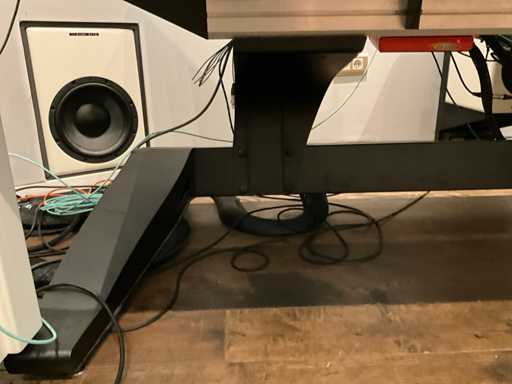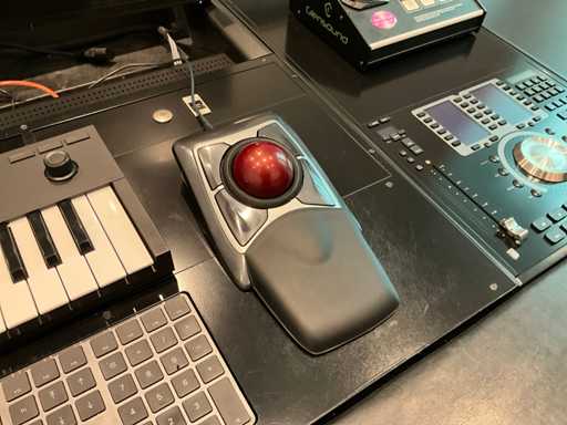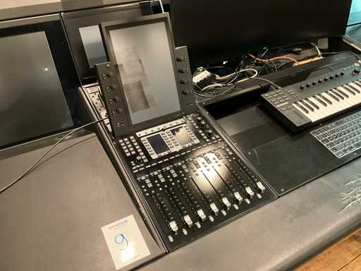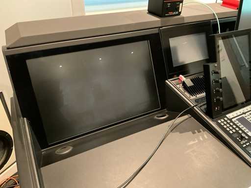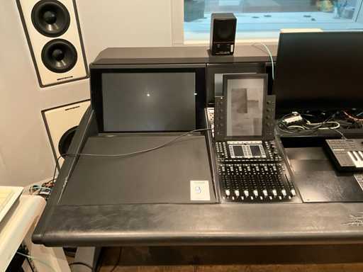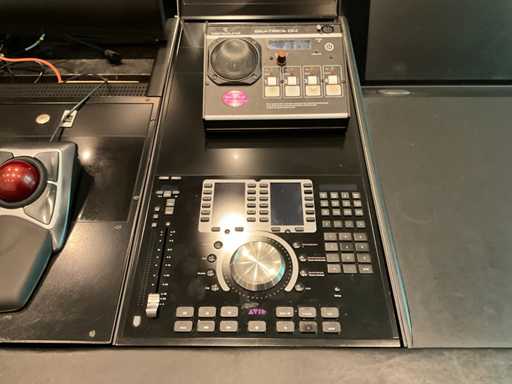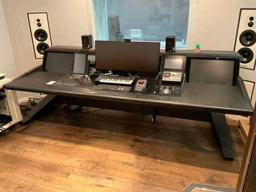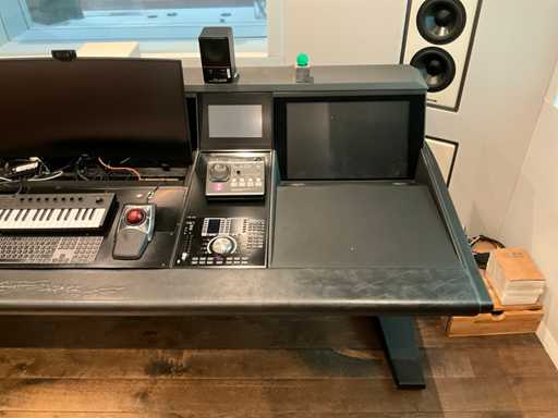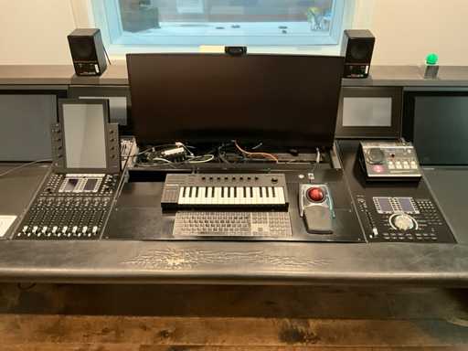 L’équipement comprend : surface de contrôle Avid S6 M10, Komplete Kontrol M32, souris expert Kensington K64325, interphone audio réseau 4 canaux Glensound Beatrice D4, 2 haut-parleurs actifs Fostex 6301B, Dell Ultrasharp U3818DW un écran ultra-large incurvé de 38 pouces, Sonifex Red Box