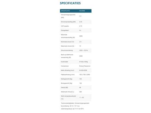 À contrôler via Wifi, Puissance calorifique (kW) 2.2, Raccordement électrique (kW) 0.53, Valeur COP 4.15, Classe énergétique A+, Courant maximum de raccordement (W) 3000, Courant nominal (A) 2.9, Courant maximum (A) 15, Alimentation 220V ~ 50 Hz, Chauffage électrique d’appoint (W) 2000, Réfrigérant R134a/1050g, Compresseur rotatif/Panasonic, Dimension nette (mm) Φ 620×2038, Dimensions de l’emballage (mm) 700 x 700 x 2090, Poids net (Kg) 130, Poids brut (Kg) 140, Bruit (dB) 48, Capacité du réservoir d’eau (L) 300, Plage de température de fonctionnement (°C) -7 ~ 43
