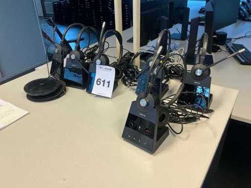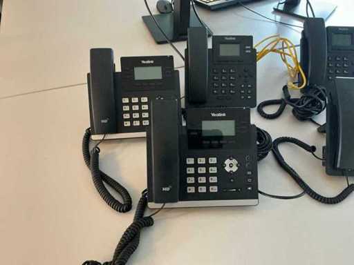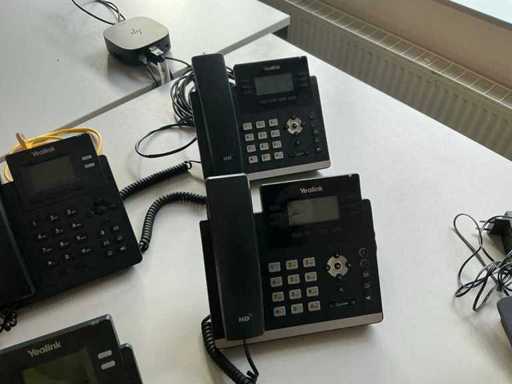 9x téléphone de bureau Yealink, 2x combiné, 6x casque Jabra avec station d’accueil, 1x enceinte