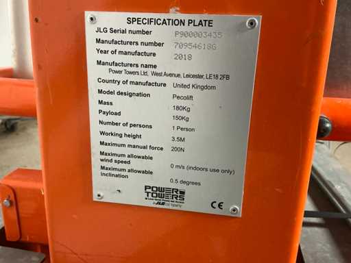 Télésiège passagers JLG Power Towers Pecolift manuel 3,5 m 2018