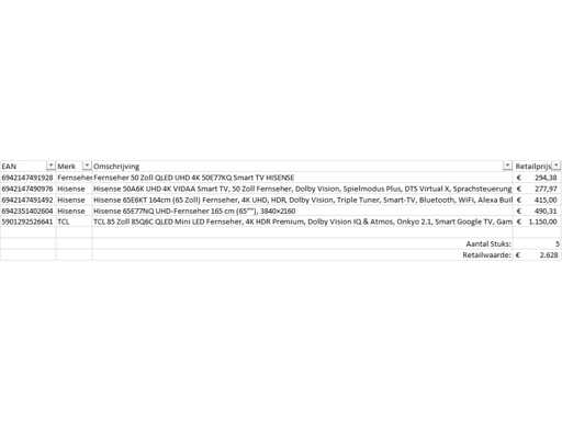 Il s’agit d’un lot de téléviseurs retournés par un grand détaillant en ligne. Le parti se compose de téléviseurs de différentes tailles. Nombre de pièces : 5. Valeur de vente au détail : 2628 €,- Les téléviseurs ne fonctionnent pas et peuvent être utilisés comme pièces. Venez le jour de la séance pour bien comprendre la raison du retour. Voir les photos pour la liste des contenus.