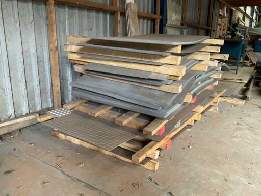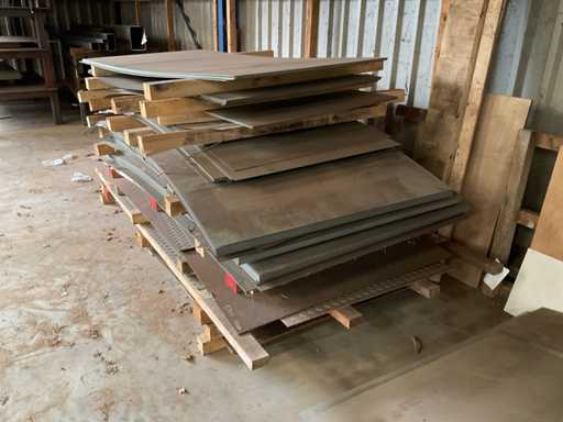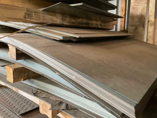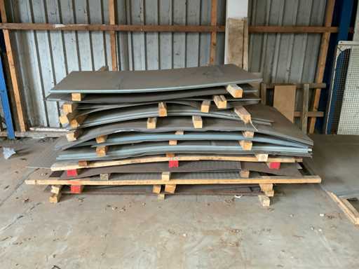 9 couches existantes de tôle d’acier Zincor, dont environ 46 pièces 1500x3000x1mm, 40 pièces 1000x2000x1mm, 75 pièces 1250x2500x1mm, 26 pièces 1000x2000x1.5mm, 6 pièces 1000x2000x3mm, restes de tôle striée, poids environ 5000 kg