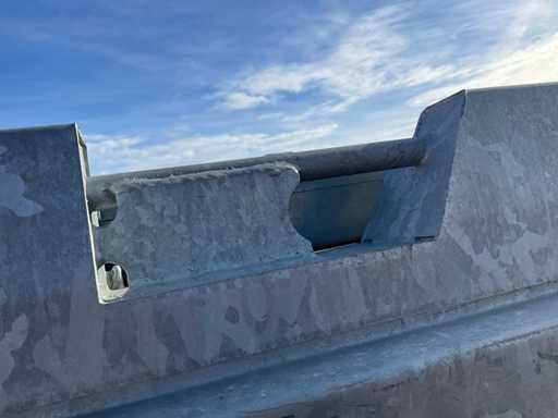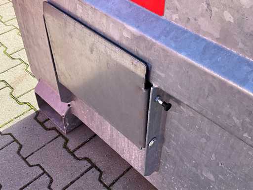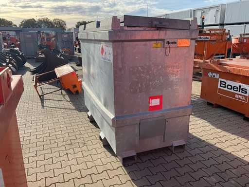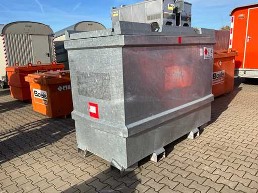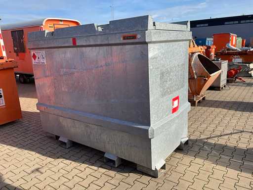 acier galvanisé ; épaisseur de l’acier 3 mm ; couvercle à charnière ; capacité maximale 3000 litres ; lever les yeux ; Empilable; fentes de fourche pour chariot élévateur ; état de travail non vérifié ;