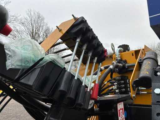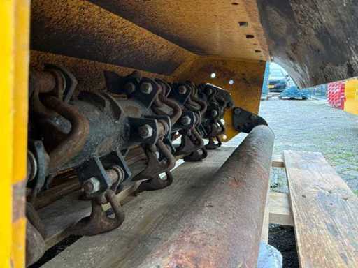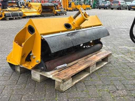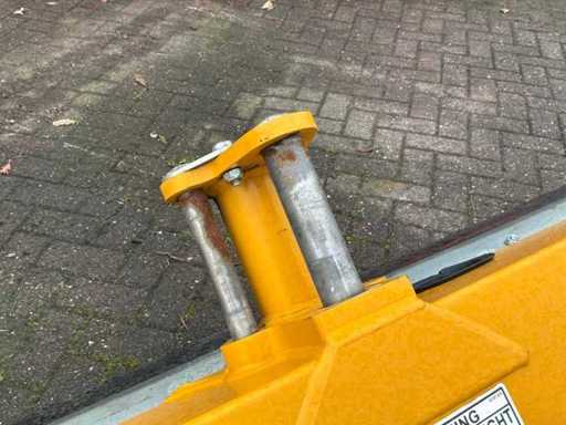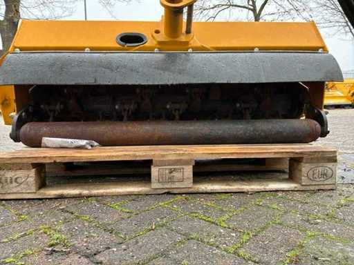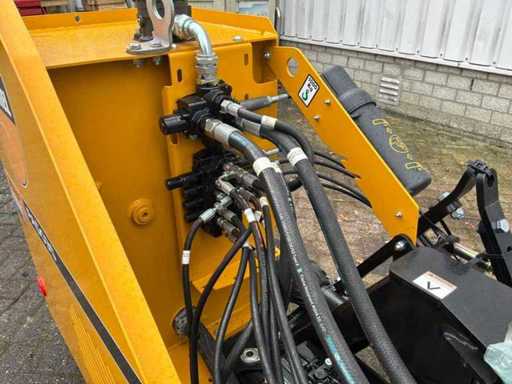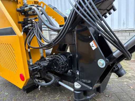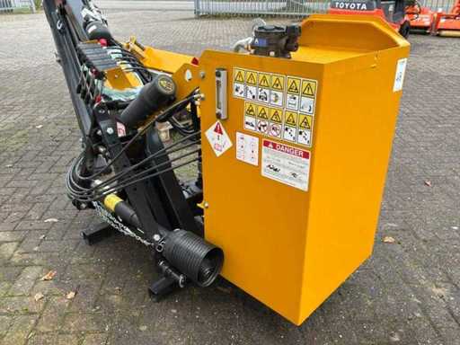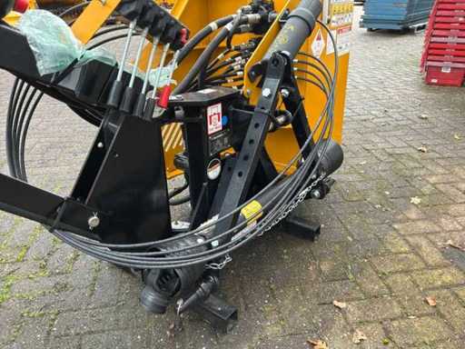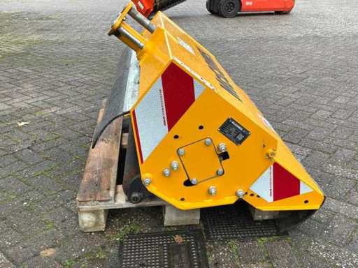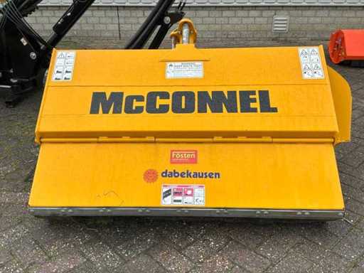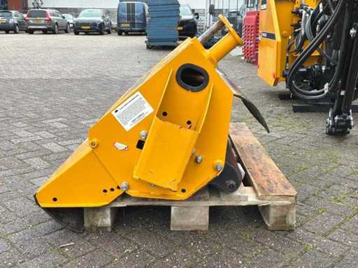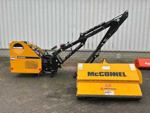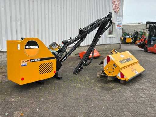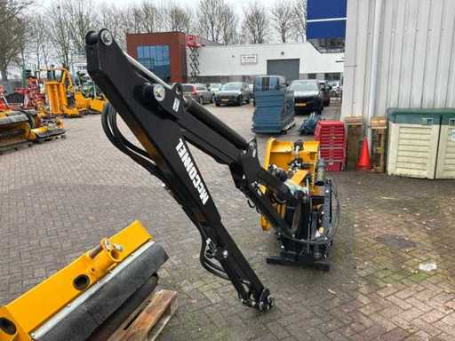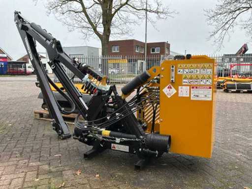 Arbre de prise de force entraîné hydrauliquement, dispositif à trois points, destiné à être utilisé sur les emponts et haies. Bras en deux pièces. Y compris des congés payés séparés. Tête de fléau McConnel avec connexion à la poignée à goupille, largeur de coupe : 120 cm