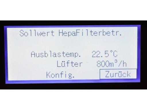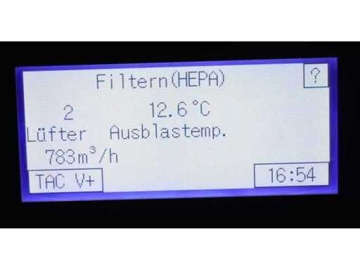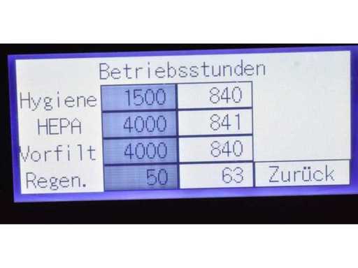 Interne n° 910771, numéro de série. 200900105794, construit en 2020, heures : 2183h, débit d’air sans filtre 2500 m³/h, volume d’air d’air d’échappement filtre HEPA H14 1600 m³/h, zone nette à 10 changements d’air/heure 160 m³, zone nette à 15 changements d’air/heure 107 m³, zone propre à 20 changements d’air/heure 80 m³, zone propre à 25 changements d’air par heure 64 m³, pré-filtre filtre F7, capacité de chauffage pour la décontamination du filtre HEPA H14 2,5 kW, Tension de connexion 220-240 V, 50/60 Hz, classe de protection IP 23, courant nominal 12,9 A, fusible 13 A, niveau sonore (distance 1 m) 54 dB(A), distance aux murs/objets 50 cm, caractéristiques spéciales montées sur des rouleaux,