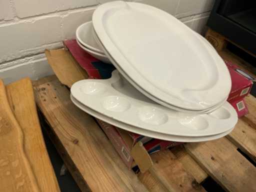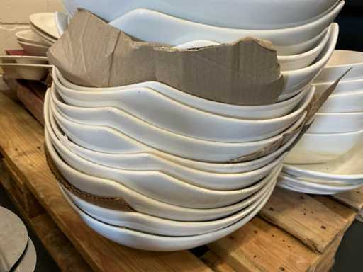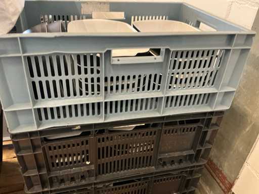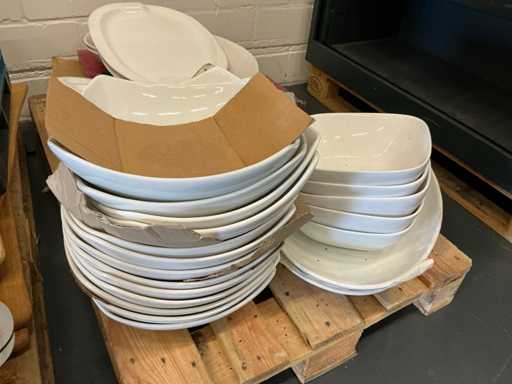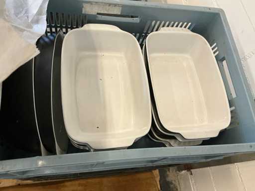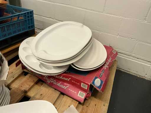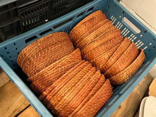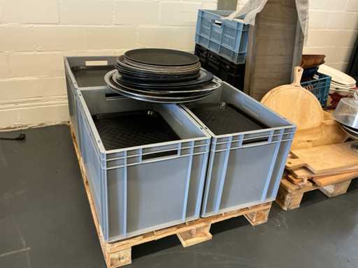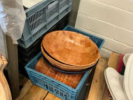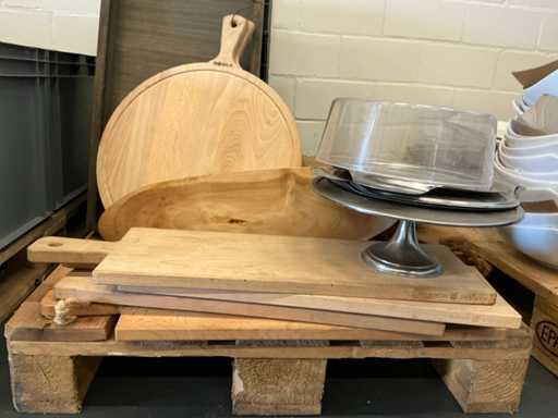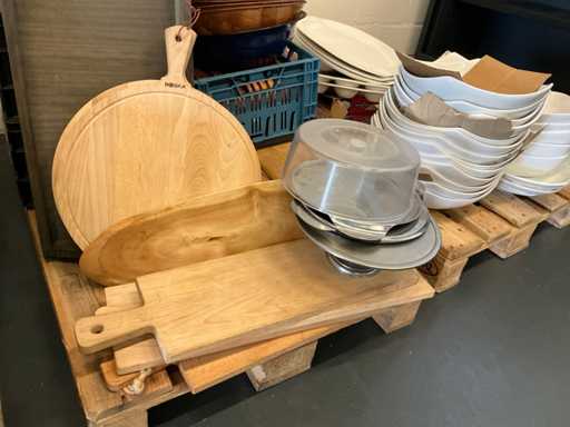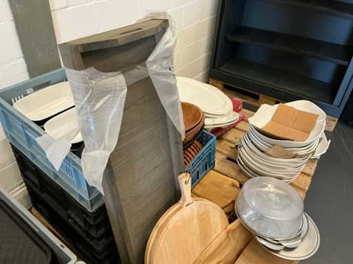 Equipé de : diverses planches de service en bois, divers plats à four, diverses corbeilles à pain, divers présentoirs à gâteaux, divers plats en faïence, +/- 200 plateaux en libre-service
