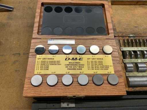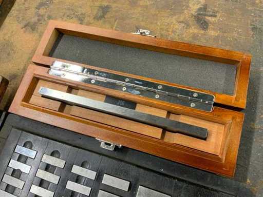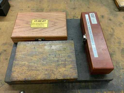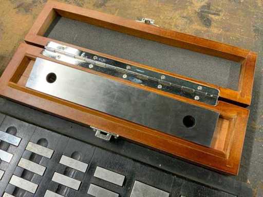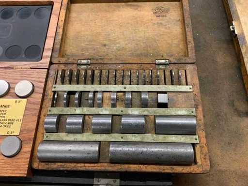 Divers incluant plaques de valeur rh, cales, jauges d’extrémité, tige d’étalonnage dans des boîtes en bois