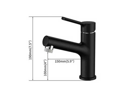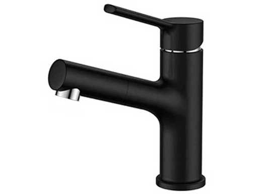 Questo rubinetto per lavabo è in ottone e ha una finitura nera opaca con dettagli cromati.