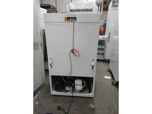 52 cm di larghezza, 32 cm di profondità, 16 cm di altezza. Capacità per cassetto di circa 30, per un totale di circa 90 cartoni al plasma. Isolamento abitativo, spesso 70 mm, realizzato in materiale di alta qualità, schiumoso a pressione ed ecologico. Porta con telaio di sigillatura magnetica in plastica facilmente sostituibile, chiudibile a chiave. Quando la porta viene aperta, non c'è alcun sbalzo laterale. Il raffreddamento ad aria circolante con una ventola assiale, che si spegne automaticamente quando la porta viene aperta, garantisce un controllo uniforme della temperatura e riduce al minimo il gradiente fisico indotto di temperatura. Sbrinamento rapido, automatico, tramite sbrinamento a gas caldo, con monitoraggio termico e limitazione di tempo. Evaporazione della condensa nella sala macchine refrigerate. Centro di controllo protetto da interruttori a chiave con display digitale della temperatura. Immagazzinamento a temperatura minima/massima. Segnale d'allarme visivo e acustico in caso di deviazione di temperatura con contatto senza potenziale per il collegamento alla tecnologia di controllo centrale. Standard con interfaccia RS 485. Controllo della temperatura tramite regolatore elettronico di temperatura. La temperatura viene mantenuta automaticamente, indipendentemente dal cambiamento delle temperature esterne. Refrigeratore, ventilato forzatamente, sigillato ermeticamente, a basso rumore, adatto al servizio, per corrente alternata 220 – 240 V, 50 Hz.