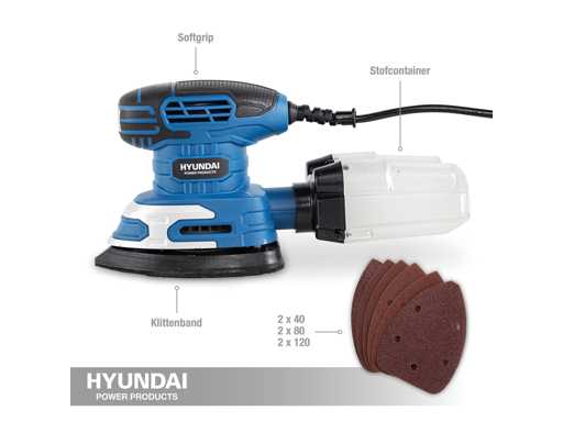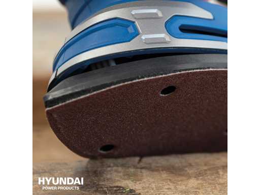 • Strumento affidabile per l'uso quotidiano. Questa pratica levigatrice HYUNDAI è molto adatta per carteggiare superfici piane grandi e facilmente raggiungibili in legno, plastica e metallo. La macchina ha un manico per il palmo, così puoi facilmente tenerla sotto controllo.