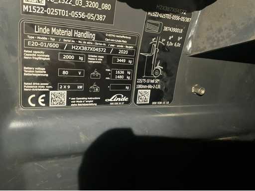2020 Linde E20-01/600 2000KG Carrello elevatore imballato con regolatore a cucchiaio