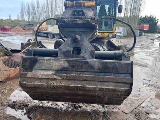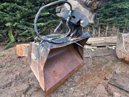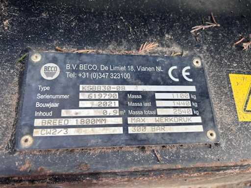 Offerto in vendita: robusta benna ribaltabile idraulica BECO, tipo KSB B30-08, adatta per escavatori con attacco CW2/3 - Questa benna ha una larghezza di 1.800 mm e una capacità di 0,9 m³, ideale per lavori di sterro, profilatura e livellamento - La benna ribaltabile è dotata di cilindri idraulici e giunti, pressione di esercizio fino a 300 bar - Peso proprio 1.100 kg e carico massimo 1.440 kg (totale 2.540 kg) - La benna è funzionale e completa di linee idrauliche e innesti rapidi. Ci sono segni di usura come ruggine e un punto di usura/piccolo foro sul fondo, ma per il resto la costruzione è intatta.