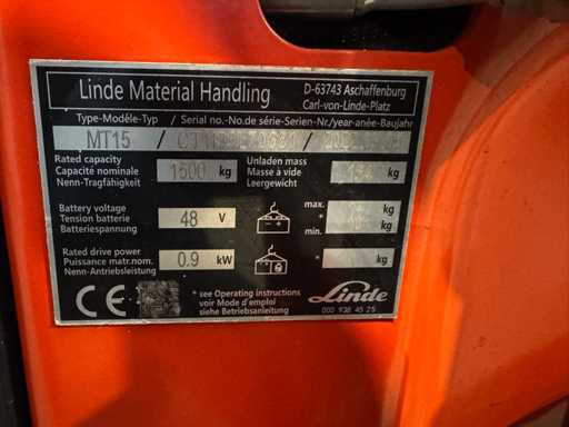 2022 Linde MT15 1.500kg 48 Volt LI-ION Litio Transpallet Ant 243 ore