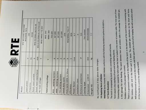 Dimensione della scatola 500x325x350mm; corrente di ingresso nominale A MIG; 35/MMA; 38/TIG28; Capacità nominale in ingresso KVA MIG; 8.05/MMA; 8,74/TIG; 6,44;